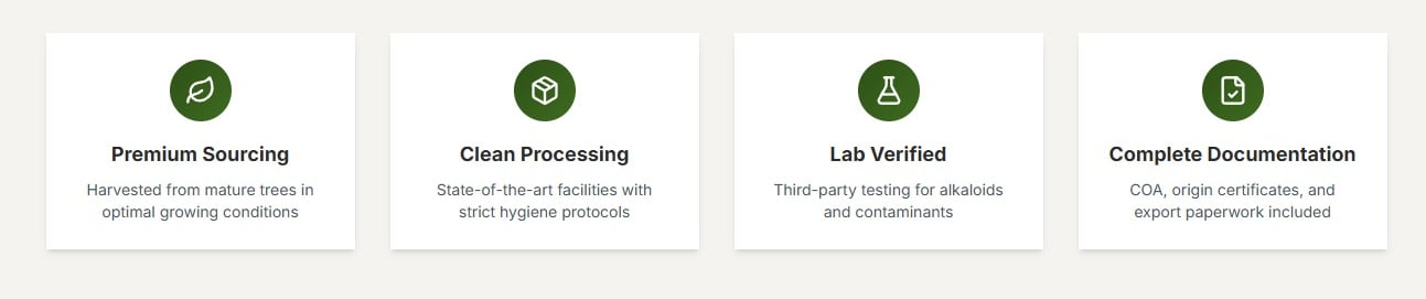We can accommodate custom mesh sizes, alkaloid profiles, and packaging requirements for your specific needs.